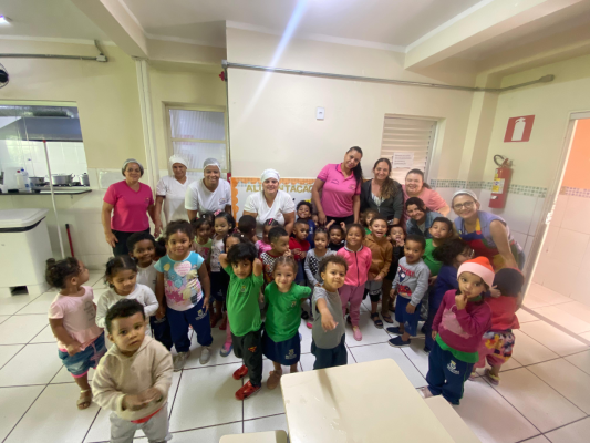 Por fim, as crianças puderam tocar, cheirar e provar os ingredientes durante o preparo, o que gerou curiosidade e entusiasmo. Ao final de cada dia, a receita era servida na merenda, permitindo que elas vivenciassem a transformação dos alimentos do cru ao prato.