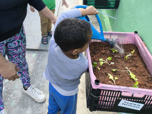 Tudo começou com uma visita à cozinha da creche, onde as crianças conheceram o processo de pesagem dos alimentos. A partir dali, a curiosidade virou ação: a escola passou a cultivar uma nova horta suspensa, revitalizar o jardim e explorar sabores e saberes da cultura indígena e afro-brasileira.