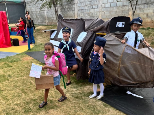 O ponto alto veio com a simulação da viagem: cada estudante tirou seu “passaporte”, preparou sua mala e embarcou em um avião bem especial: o brinquedo do parquinho, que se transformou em aeronave. A experiência foi tão real que emocionou até as famílias. Como contou Cíntia Nogueira, mãe de uma estudante: “Ver o rostinho da minha filha em ser aeromoça e poder usar sua imaginação para uma viagem incrível não teve preço. Conhecer cada detalhe e fazer parte desta construção fez com que a viagem se tornasse real na imaginação das crianças.” Uau!