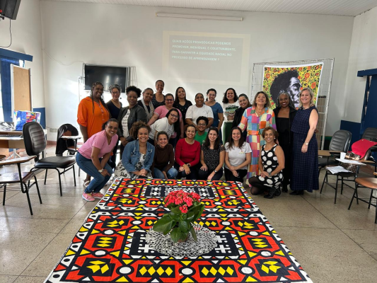 #paratodosverem: Grupo de educadoras e educadores reunidos em uma sala de aula decorada com cores vibrantes e elementos culturais afro-brasileiros. No centro, há uma mesa coberta com tecido estampado e um vaso de flores. Ao fundo, uma projeção exibe o tema: “Quais ações pedagógicas podemos promover para garantir a equidade racial no processo de aprendizagem?”.