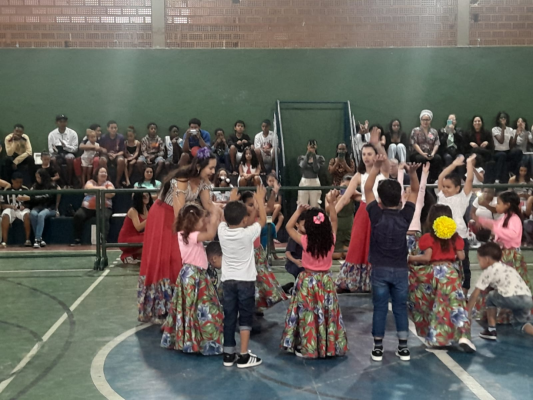 #paratodosverem: A imagem mostra uma apresentação infantil em um ginásio. Um grupo de crianças, acompanhado por educadoras, participa de uma dança circular. As meninas vestem saias coloridas e floridas, e os meninos usam roupas casuais. Ao fundo, o público assiste atentamente, sentado nas arquibancadas.
