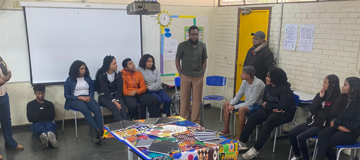 #paratodosverem: Em uma sala de aula, estudantes estão sentados em círculo ouvindo dois convidados que falam em pé. No centro, há uma mesa coberta com tecido estampado e livros sobre ela. A turma observa atentamente, compondo um ambiente de diálogo e troca.
