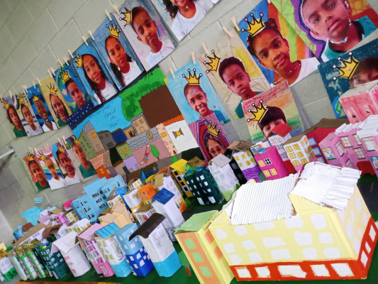 #paratodosverem: A imagem mostra uma exposição escolar com retratos de crianças usando coroas desenhadas sobre fundos coloridos. Abaixo, há diversas maquetes de casas e prédios feitos com papel e papelão, pintados em cores vivas como azul, rosa, verde e amarelo.