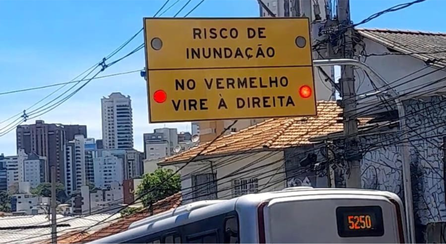 Os dispositivos também oferecem informações, por meio de frase como ‘Risco de inundação/ No vermelho, não avance’, reforçando o caráter preventivo da sinalização.